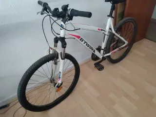 Bicicleta B'TWIN de color blanco, ideal para paseos y rutas. Las medidas de la rueda se ven en la foto de la rueda. - Cuadro de aluminio. - Suspensión delantera. - Frenos de disco.
