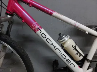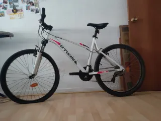 Bicicleta de montaña Rockrider en color blanco con detalles en rosa. Ideal para iniciarse en el ciclismo. Como nueva, nunca se uso - Suspensión delantera. - Frenos sistema tipo V-brake. - Ruedas Cuadro: Fabricado en aluminio, lo que la hace ligera Transmisión: 3 platos y 7 piñones para un total de 21 velocidades. Suspensión: Cuenta con una horquilla de suspensión delantera para absorber impactos en terrenos irregulares.