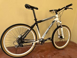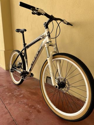 Bicicleta de montaña con un diseño moderno y llamativo. - Cuadro de aluminio. - Ruedas de 26pulgadas. - Frenos de disco. -Cadena nueva -Monoplato -Cableado y fundas nuevas -Puños nuevos -Neumático y camara delantera y trasera nueva -Totalmente revisada y puesta a punto