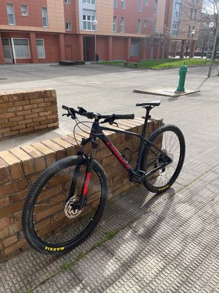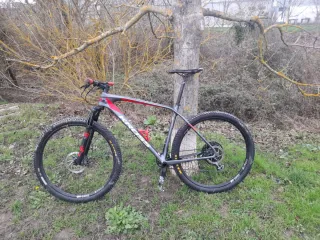 Bicicleta de montaña Conor WRC Storm en color negro. - Talla L. - Cuadro de carbono. - Suspensión delantera rock shox recon 130mm y trasera rockshox monarch. - Frenos de disco hidráulicos shimano acera mt401. - Mandos Shimano deore 12v. - Cambios Shimano slx. - Cadena sram. - Ruedas de 29 pulgadas. - Tija telescópica. - Pedales mixtos. Poco uso. Neumáticos originales (está para cambiar el trasero). Un pequeño roce en el cuadro.