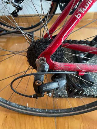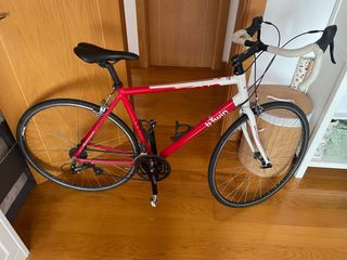 Bicicleta de carretera BTWIN Sport. - Cuadro de aluminio. - Diseño deportivo en color rojo y blanco. - Grupo Shimano 3X8 velocidades - Pedales mtb automaticos - Viene con regalo de camara para repuesto