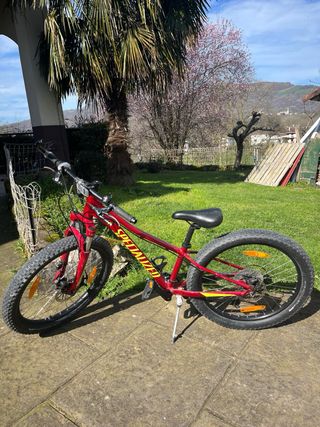 Bicicleta Cadete Specialized de montaña en color rojo. Modelo Big Rock. - Cuadro de aluminio. -Manillar ajustable. -Sillin ajustable. - Ruedas anchas para mayor agarre (24x2.8) - Frenos de disco.
