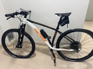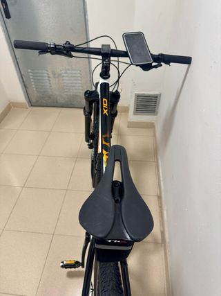 Bicicleta de montaña Mendiz X10 con cuadro blanco y detalles en naranja. - Cuadro de aluminio. - Ruedas de 29 pulgadas. - Frenos de disco. - Transmisión Shimano. - Horquilla RockShox. Comprada por capricho, y se vende por no usarla. Solo se ha usado dos veces (literal) en carril bici pocos km por lo que prácticamente está a estrenar. Se entrega con casco, cuenta km, bolsa teléfono Venta en persona