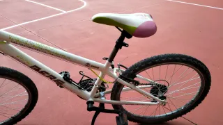 Bicicleta de montaña ROCKRIDER en muy buen estado, lista para usar. 🎨Color blanco con detalles en rosa. 🛞Ruedas MTB de 26”. ⛓️Cuadro de aluminio. 🚴🏽♀️Incluye portabidones.