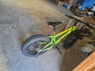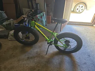 Bicicleta tipo Fat Bike con un llamativo color verde y detalles amarillos. Ideal para todo tipo de terrenos. - Ruedas anchas para máxima tracción. - Cuadro robusto. - Frenos de disco.Vendo Fat Bike modelo Berg Blast en color verde flúor. Ideal para terrenos como arena, nieve o montaña. Ruedas: Chaoyang Sand Storm (neumáticos anchos). Frenos: Disco en ambas ruedas. Estado: Buen estado general de cuadro y pintura. Aviso: La rueda trasera está deshinchada (posible pinchazo), de ahí el precio rebajado. Ideal para quien quiera ponerla a punto rápidamente.