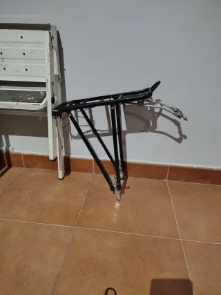 Portaequipajes de bicicleta en color negro. - Fabricado en hierro,es resistente. - Diseño adaptable a diferentes cuadros de bicicleta. - Goma elástica con ganchos incluida. Tiene algún arañazo propio del uso que se ve en la última foto.Precio no negociable