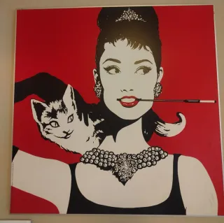 Decorativo cuadro estilo pop art de Audrey Hepburn con un gato. - Diseño icónico en rojo, blanco y negro. - Representación artística de Audrey Hepburn. - Incluye un gato en la composición. Enmarcado con marco de metal 98cm X 98Cm