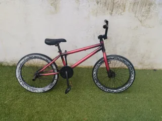 Bicicleta BMX de color rojo. - Cuadro de metal. - Ruedas con llantas blancas. - Sillín negro. -Pegs traseros -Profesional sin frenos