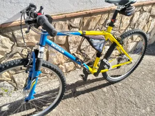 Bicicleta de montaña Dawes con cuadro amarillo y azul. - Ruedas de 26 pulgadas. - Cambio Shimano. -Agarraderas desgastadas -Asiento desgastado -Bicicleta en estado muy bueno las -marchas necesitan mantenimiento y los frenos delanteros.
