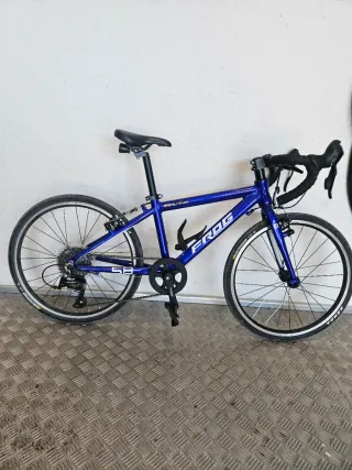 Bicicleta de carretera infantil Frog 58 en color azul. En muy buen estado. Viene montada con ruedas de carretera y de gravel de repuesto. Ideal para iniciarse a la carretera o gravel. - Cuadro de aluminio. - Ruedas de 20 pulgadas. - Frenos de mano. - Cambio de 9v Shimano Sora