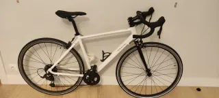 Bicicleta de carretera Van Rysel en color blanco. Talla S y modelo 2025. No incluye pedales Keo Look, sino los originales. - Modelo Carretera 8V. - Cuadro de aluminio. - Frenos de zapata - Transmisión microshift 8 velocidades - Monoplato 40 dientes - Casette 11x34 (11-13-15-18-21-24-28-34)