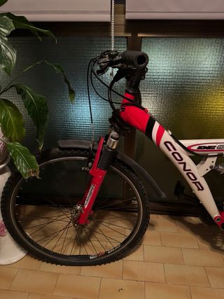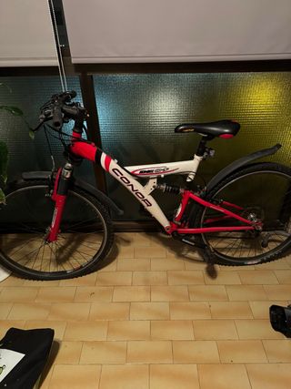 Bicicleta de montaña Conor DE09 con suspensión delantera y trasera. - Cuadro blanco y rojo. - Ruedas de 26 pulgadas. - Frenos de disco.
