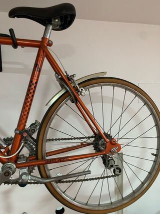 Bicicleta clásica Peugeot Carrera en color cobre. Un modelo icónico para coleccionistas y amantes del ciclismo vintage. Restaurada , con todos sus componentes originales. - tamaño cadete - Cuadro de acero. - Guardabarros delantero y trasero. - cambios de platos y piñones.