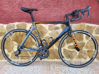 Bicicleta de carretera Giant con un diseño deportivo en negro y detalles naranjas. - Cuadro de carbono. - Ruedas Giant PA-2. - Talla ML - Transmisión Shimano Ultegra - 2 x 11 V - Cables internos