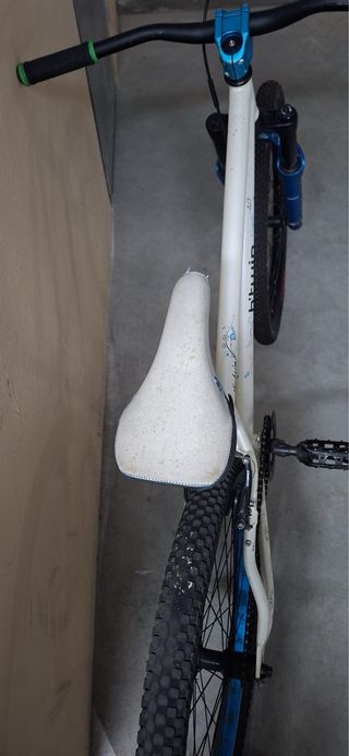 Bicicleta de dirt jump con ruedas de 26 pulgadas y freno trasero. - Cuadro blanco. - Horquilla delantera azul. - Ruedas cambiadas.