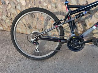 Bicicleta de montaña con suspensión delantera y trasera. - Cuadro de aluminio. - Ruedas de 26 pulgadas. - Frenos de disco. - Cambio Shimano.