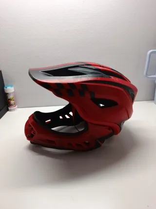 Casco de bicicleta con un diseño deportivo en rojo y negro. - Diseño a cuadros en los laterales. - Visera integrada. - Múltiples ventilaciones para mayor comodidad.