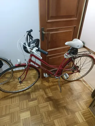 Bicicleta clásica de color rojo, modelo Geace. - Cuadro de metal. - Sillín blanco. - Ruedas de radios. - Portaequipajes trasero. Muy buen estado.