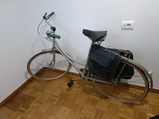 Bicicleta clásica de estilo vintage, ideal para paseos urbanos. - Cuadro plateado. - Manillar y puños verdes. - Sillín negro con muelles. - Portabultos trasero con alforjas negras.