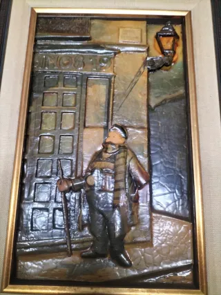 Cuadro tridimensional con una réplica de una obra de Anton Pieck. - Representa una escena callejera con una figura y farola. - Marco de madera oscuro. _ calle los mancebos Madera y resina posiblemente ambar.
