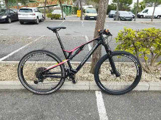 Bicicleta de montaña Rockrider XC 900 S con suspensión delantera y trasera. - Cuadro de carbono, basculante de aluminio - Ruedas de 29 pulgadas. - Frenos de disco hidráulicos sram. - Transmisión de 12 velocidades. - Pedales xt plataforma. - Tubelizada, cadena nueva con 100 km, habría que cambiar el casette. - Se puede añadir tija telescópica por 50 euros más. - Precio negociable