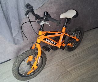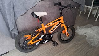 Bicicleta infantil de color naranja con ruedas de 12 pulgadas. - Cuadro de metal resistente. - Sillín ajustable. - Frenos delanteros y traseros. - Ruedines incluidos.