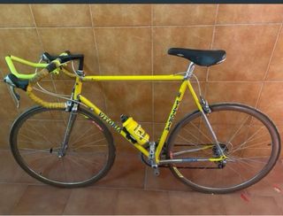 Bicicleta de carretera Vitoria en color amarillo, en muy buen estado. Medida del cuadrado es 57, sería para una altura de 1,75 a 1,80 aproximadamente Solo venta en persona - Cuadro de bicicleta de carretera. - Color amarillo. - Marca Vitoria.