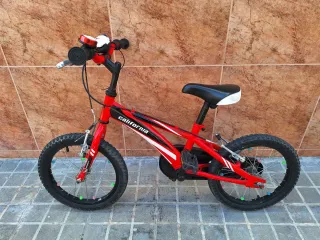 Bicicleta de niño marca California, ideal para los más pequeños. - Cuadro de color blanco y rojo. - Ruedas de 16 pulgadas. - Incluye timbre azul.