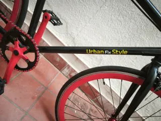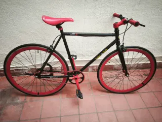 Bicicleta urbana con estilo fixie, ideal para moverse por la ciudad. - Cuadro de color negro. - Ruedas y sillín de color rojo. - Manillar deportivo. - Tiene caballete, pero se puede sacar fácilmente.