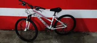 Bicicleta de montaña en color blanco con detalles en rosa y gris. Ideal para paseos y rutas. - Cuadro de aluminio. - Ruedas de 26 pulgadas. - Frenos de disco. - Suspensión delantera.