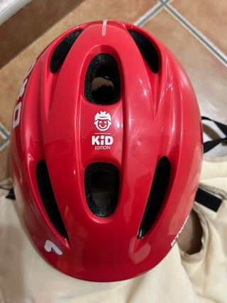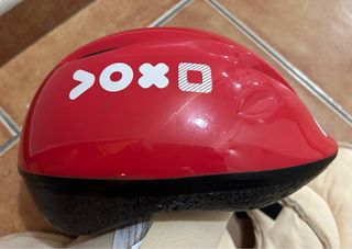 Casco de bicicleta infantil en color rojo, con un diseño moderno y llamativo. - Diseño con >OXO y un cuadrado con líneas. Regulable en tamaño. - Material exterior brillante. - Acolchado interior para mayor comodidad.