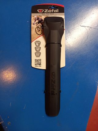 Mini bomba marca Zefal, 25 cm. Válida para válvulas Presta y Schraeder. Se incluye soporte de caucho con cinta de velcro para sujetar al cuadro.