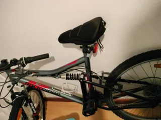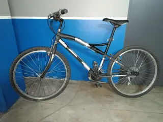 Bicicleta de montaña con suspensión delantera y trasera. - Cuadro de aluminio. - Frenos de disco. - Ruedas de 26 pulgadas. - Sillín ajustable. - Incluye casco y bolsa de sillín.