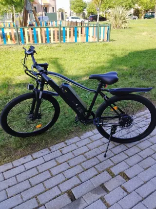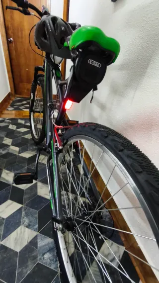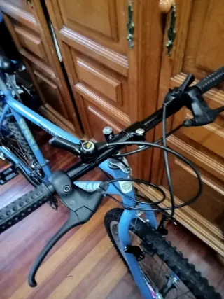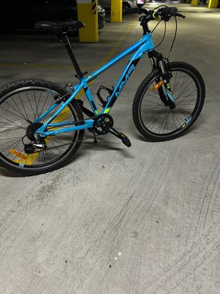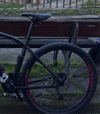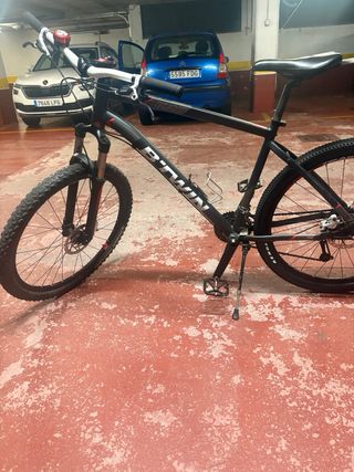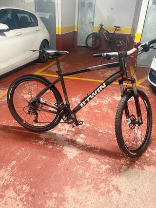 Bicicleta de montaña Btwin en color negro. Ideal para disfrutar de rutas y senderos. - Cuadro de aluminio. - Suspensión delantera. - Frenos de disco. - Ruedas de 27’5 pulgadas. La rueda de atrás está recién puesta y ambos frenos tambien. Tiene unos golpes en la parte delantera pero son bastante pequeños y el sillin tiene una leve rotura pero funciona perfectamente. Ver en la foto. Si vives por Vigo o alrededores puedo llevártela a casa.