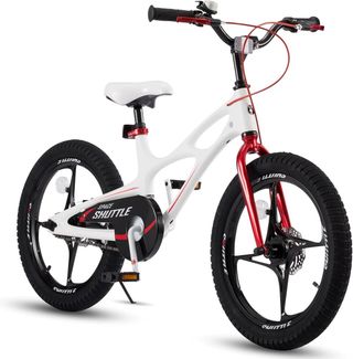 Bicicleta infantil con un diseño moderno y deportivo, inspirada en el espacio. - Cuadro blanco y detalles en rojo. - Ruedas negras con llantas de 5 radios. -Frenos de disco. - Cadena protegida por una cubierta. - Sillín blanco. - Manillar negro con puños rojos y timbre.
