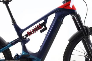 Bicicleta de montaña de color azul. - Cuadro de carbono. - Suspensión delantera y trasera. - Frenos de disco. - Ruedas de 29 pulgadas.