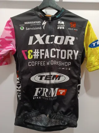 Culote corto de ciclismo de la marca IXCOR. - Diseño con mangas asimétricas en rosa y amarillo. - Logos de marcas colaboradoras visibles: Skoda, Merissatges, Servisimo, Calçats, Stitch Way, TEM, FRM. - Tejido técnico para ciclismo.