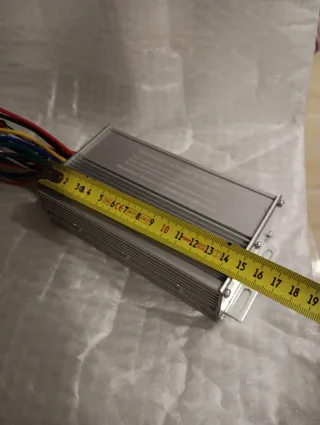 Controladora para motores DC de 36V o 48V, con una potencia de 350W y 13 amperios. - Carcasa metálica plateada. - Múltiples cables de conexión.