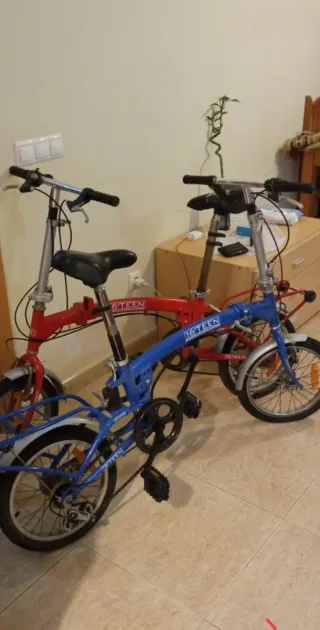 Bicicleta plegable de color roja y azul, ideal para desplazamientos urbanos o para llevarla contigo. - Ruedas de 16 pulgadas. - Marco plegable para fácil almacenamiento. - Incluye cesta delantera y portabultos trasero. Las 2 por 100 o una por 50 Negociable