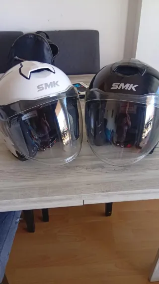 Se venden dos cascos SMK, apenas usados. Uno es talla M y el otro talla L. - Casco blanco talla M. - Casco negro talla L. - Visera transparente.