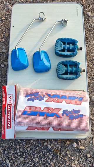 Conjunto de piezas para bicicleta BMX. - Dos pedales BMX aules nuevos - protectores cuadro y manillar esponjas BMX Racing Team. -Espejos azules nuevos Rabasa derbi motoreta planter etc