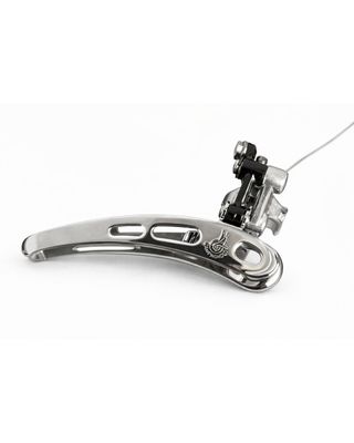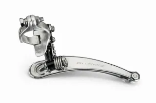 Desviador delantero de bicicleta de la marca Campagnolo. - Fabricado en metal plateado. - Diseño clásico y elegante.