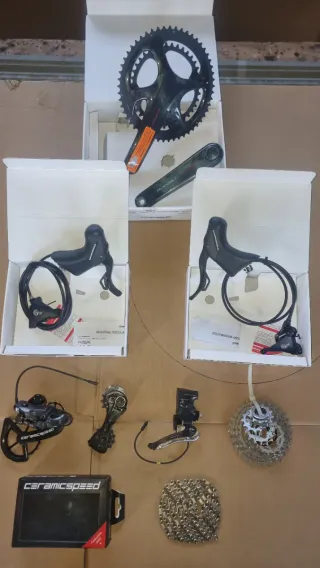 Grupo electrónico completo campagnolo super record EPS de 12 velocidades. Para freno de disco. Incluye manetas de cambio con latiguillos y pinzas de freno a estrenar en sus cajas y con factura. Bielas y rodamientos cerámicos a estrenar en su caja y con factura. Por otra parte cambio trasero con patilla Ceramic Speed ORIGINAL (se incluye la de serie), desviador delantero, cadena super record, cassette super record 12-32 y discos de freno campagnolo, todo con muy poco uso como nuevo.