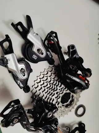 Conjunto de transmisión Shimano para bicicletas. - Cambio trasero Shimano Deore y otro XT (deteriorado). - Desviador delantero Shimano Deore 3v - Cassette de 10 velocidades relaciones 12-36. - Pulsador de cambio Shimano SLX 2/3X10. Entrega en mano zona las tablas. NO SE HACEN ENVIOS.