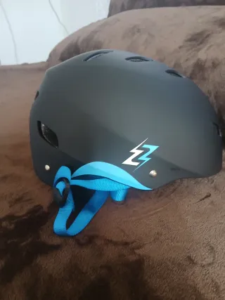 Casco protector de color negro con detalles en azul. - Diseño moderno con logo. - Correa ajustable azul. - Ventilación superior.