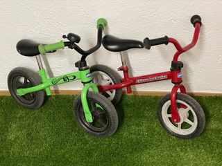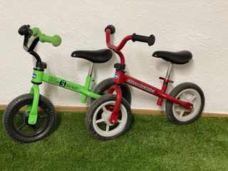 Se venden dos bicicletas de equilibrio de la marca Chicco, ideales para los más pequeños. - Una bicicleta es de color verde con detalles en negro y texto Chicco Green Rocket 5 - La otra bicicleta es de color rojo con detalles en negro y el texto Chicco Red Bullet. - Ambas tienen sillín negro regulable. La roja con cierre rapido. - Algunas marcas de uso - Timbre bicicleta verde no incluido. Entrega en mano en Dosrius o Mataró