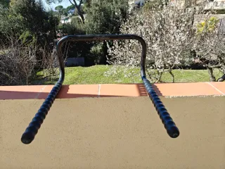 Soporte de pared para bicicletas Decathlon SV300. Dispongo de 4 unidades. Precio por unidad. - Color negro con empuñaduras azules. - Diseño robusto para colgar 2 bicicletas.