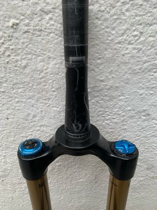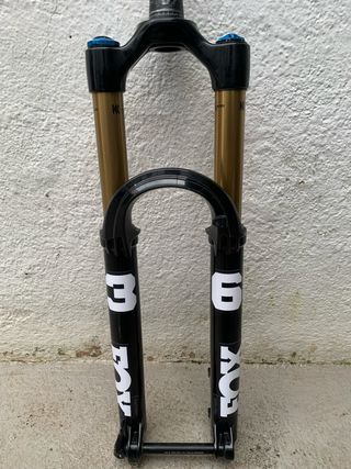Horquilla de suspensión Fox 36 Factory para bicicletas de 29 pulgadas. - Modelo: 36 Factory - Recorrido: 160 mm - Amortiguador: Grip2 - Acabado: Kashima - Diámetro de rueda: 29 - Color: Negro y dorado -Tubo de 17cm -Corona 68 - 2390gr con eje -Típicas rayadas en botellas y una en barra solo estéticas