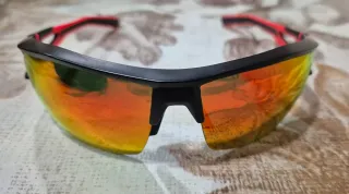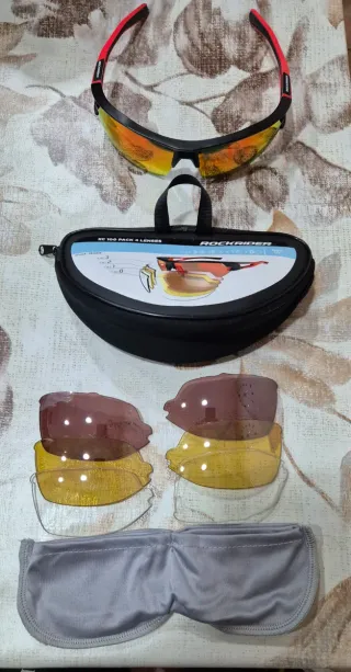 Set de gafas de ciclismo Rockrider XC 100 con 4 lentes intercambiables. - Montura negra con detalles rojos. - Incluye funda rígida y funda de tela. - Lentes de diferentes categorías para distintas condiciones de luz.