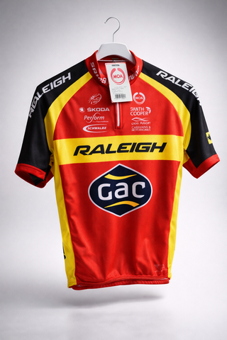 Maillot de ciclismo vintage de la marca MOA Sport, con diseño de Raleigh y detalles de Campagnolo. - Colores: rojo, amarillo y negro. - Logo de Raleigh en grande en el pecho. - Logos de Skoda, Perform, Schwalbe, Santh Cooper, Jon Amott, Caravans & Motorhomes y Gac. - Cremallera frontal.